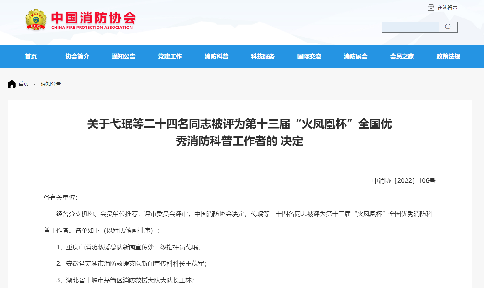 各分支机构,各单位会员: 12月15日,经专家评审和公示,我会推荐的重庆市消防救援总队新闻宣传处一级指挥员弋珉及其他省份等二十四名同志被中...