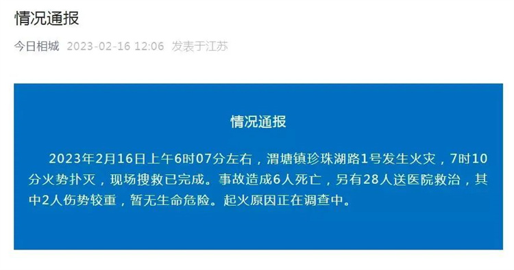2月16日(今日)凌晨,江苏苏州相城区发生一起火灾。 随后,苏州“今日相城”微信公众号发布信息:2023年2月16日上午6时07分左右...